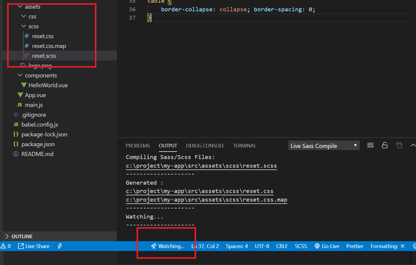 Watching... 이라는 메세지와 함께, 같은 경로에 컴파일된 reset.css와 reset.css.map 파일이 생성된 것을 확인할 수 있다.