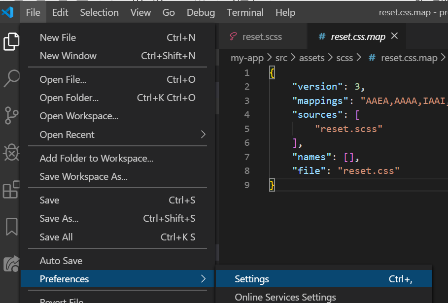 이제 세팅을 저장해 주고, 다시한번 reset.scss를 저장해주면, "savePath" 의 위치에 컴파일된 css파일과 .map 파일이 생성된다.